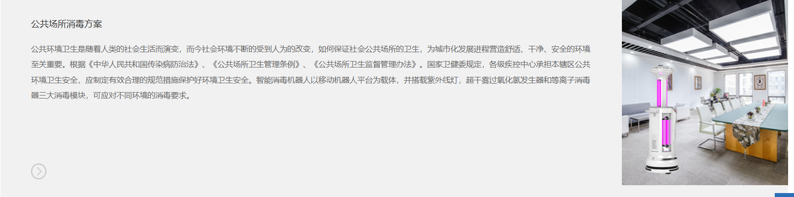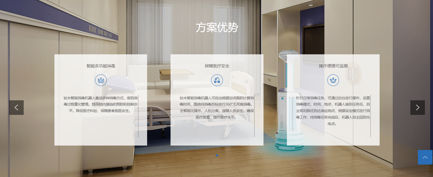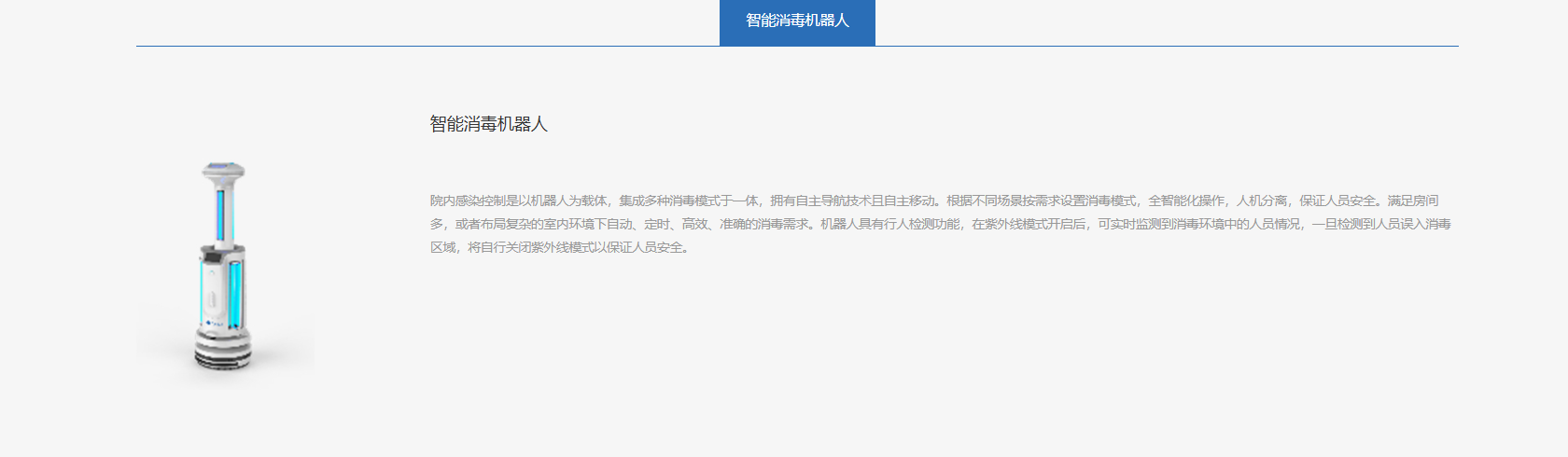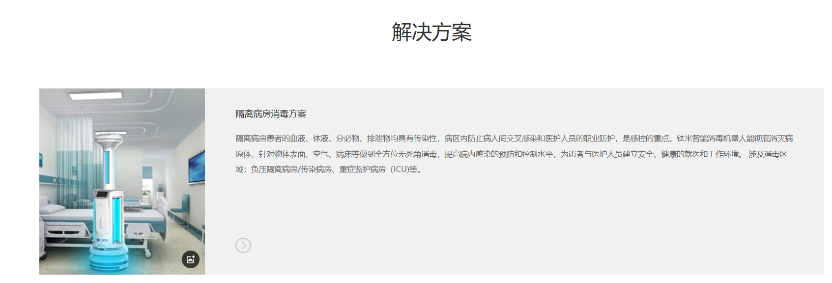 适应症/术式智能消毒机器人适用于院内环境(如手术室、病房、门诊大厅)的物表和空气终末消毒与多点预防性消毒。