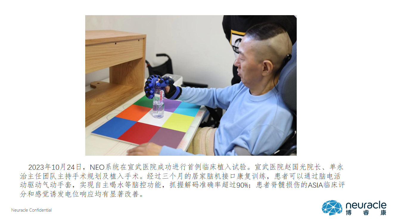 适应症/术式NEO系统主要适用于因严重神经疾病(如渐冻症、脊髓损伤)导致运动功能丧失、且常规治疗无效的患者,旨在为其重建运动与沟通功能。