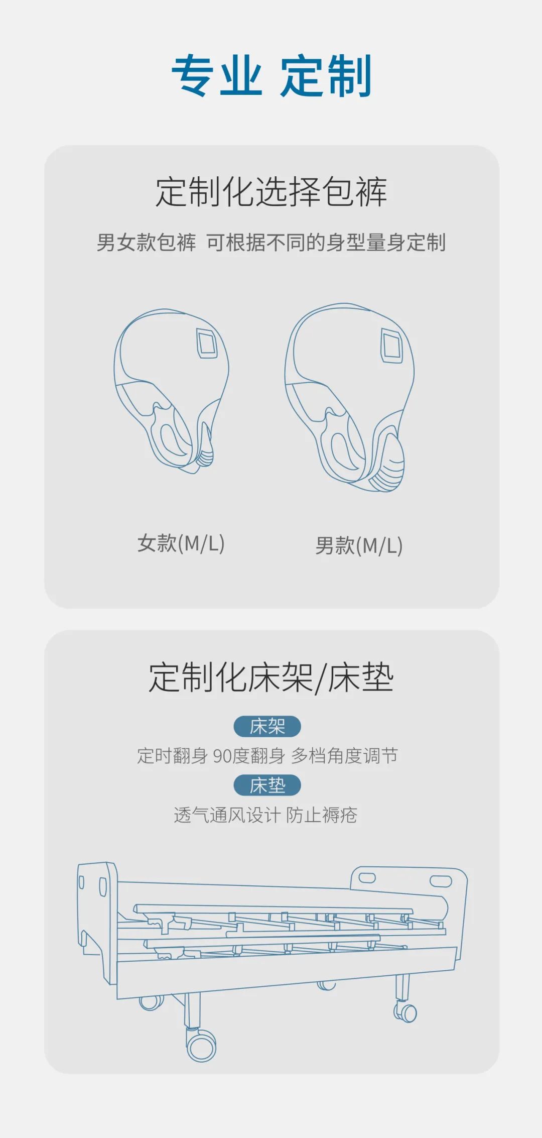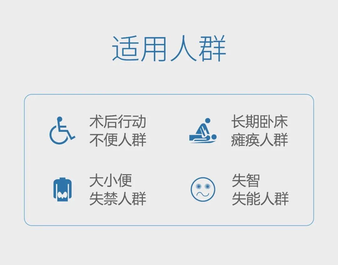 适应症/术式适用于因失能、失智、瘫痪或术后等原因导致行动不便、大小便失禁,需要他人协助完成排泄护理的人群。